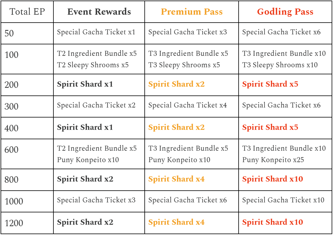 เช่นเคย การสะสม EP จะช่วยปลดล็อกรางวัลต่าง ๆ ที่น่าตื่นเต้นใน DoodiRanch โดยทุกคนมีสิทธิ์รับรางวัล และสำหรับผู้ที่มีบัตร Godling หรือ Premium Pass จะได้รับของรางวัลชุดใหญ่จัดเต็มยิ่งกว่าเดิม: