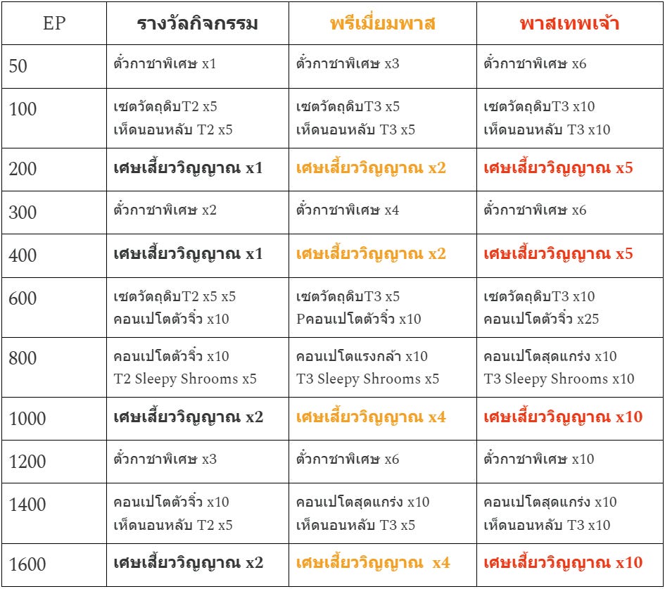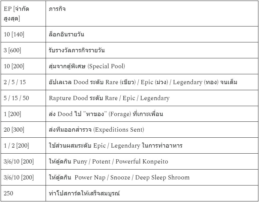 รายการภารกิจสำหรับสะสม Event Points (EP)