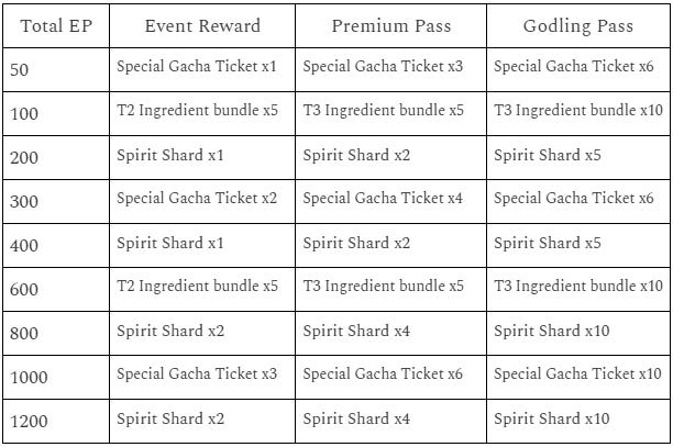 คุณจะได้รับรางวัลตามจำนวน EP ที่สะสมได้ และสำหรับผู้ที่ถือครอง Godling Pass และ Premium Pass จะได้รับรางวัลพิเศษเพิ่มเติมด้วย!